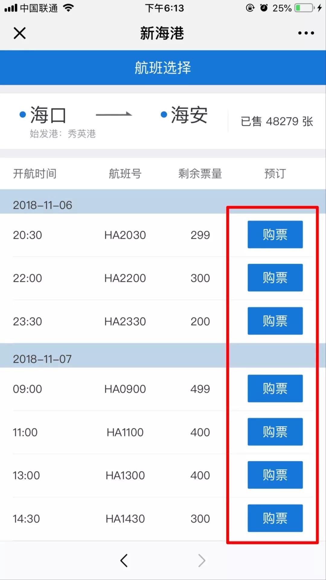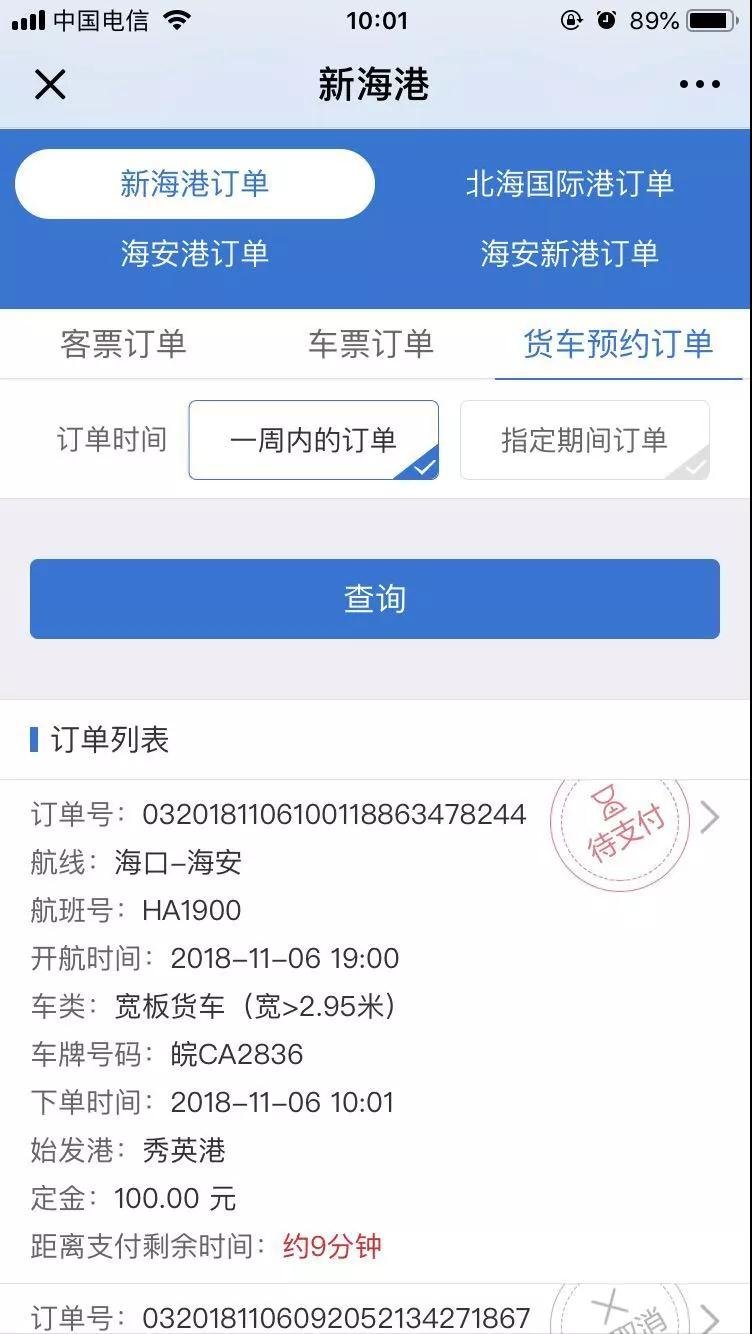 注意事項 1、進港時間為開航前180分鐘至45分鐘,開航前30分鐘停止檢票; 2、建議裝載貨物完成后或準備出發來港口時再辦理預約購票手續; 3、2018年11月8日-12月31日為試運行期間,2019年1月1日正式運行,正式運行后非預約車輛將引導出港; 4、預約金額為人民幣100元整,辦理相關購票手續后系統會自動將定金全額返還回原賬戶; 5、注意選擇貨車車型,以便港口核查并加快配載速度,避免耽誤登船時間; 6、一個車牌號一個身份證號一天內只能預約一個號; 7、購票時需出示身份證給售票員進行驗證是否預約,購票人員身份證需包含預約提交的人員身份證。 預約購票流程 1、選擇航線、車型和始發港 點擊“查詢” 2、選擇航班時間 3、填寫車牌號和旅客身份證號、手機號 預約過后系統會記住您的車牌號 再次預約可以使用“常用車輛”選項 4、訂單支付 再次確認預定信息無誤后點擊“支付” 5、訂單查詢 已付款訂單和未付款的訂單都可查詢