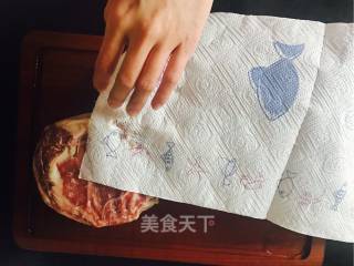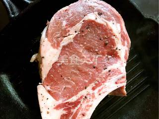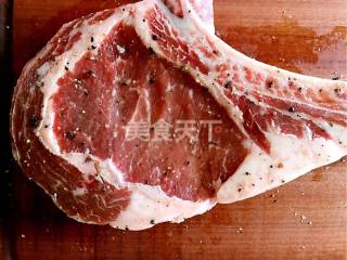 4撒上現(xiàn)磨的黑胡椒和海鹽,用的是玫瑰鹽,可以多撒點(diǎn),畢竟牛排很厚,然后涂抹一層橄欖油,用初榨的會(huì)更加好,然后給牛排做一個(gè)充分的按摩