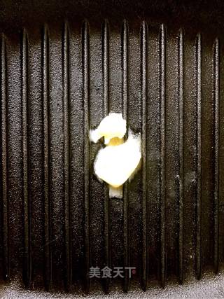 7煎鍋加熱,放入黃油,等油開后加入剛才擦拭牛排的大蒜以增添香味。