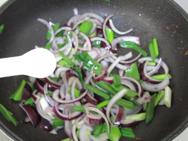 6.再把洋蔥入鍋煸炒出香味后再把大蒜入鍋繼續煸炒至大蒜變色再加入少許鹽煸炒均勻