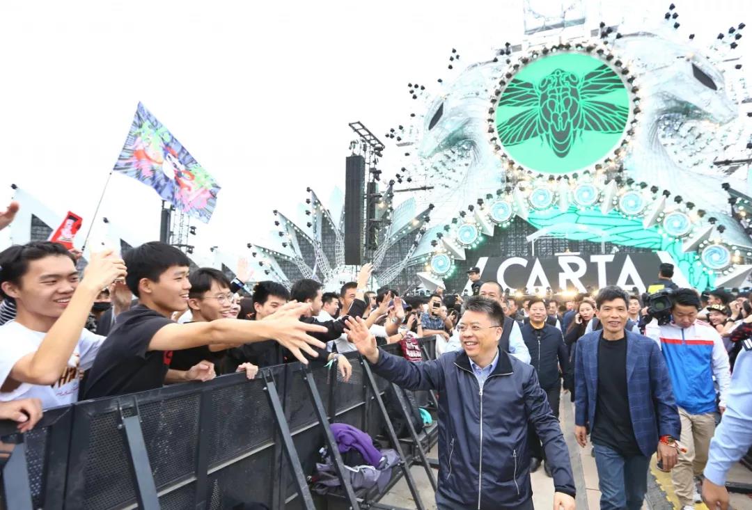 當(dāng)天下午17時(shí)許,童道馳一行抵達(dá)音樂(lè)節(jié)現(xiàn)場(chǎng),查看了場(chǎng)地布局和設(shè)施情況,聽取了安保等工作匯報(bào),并來(lái)到主舞臺(tái)區(qū)舞池中間,揮手向主控臺(tái)DJ致意,向周圍樂(lè)迷表示歡迎和問(wèn)候,與樂(lè)迷們熱情互動(dòng)。