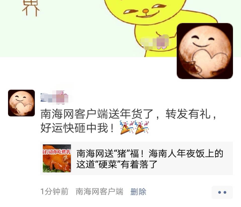STEP1:轉發此條稿子至朋友圈并加上附上一句(南海網客戶端送年貨了,轉發有禮,好運快砸中我!)(如下截圖所示)