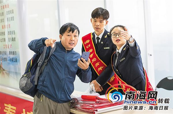 1月21日,海口新海港客運大廳內(nèi),海事志愿者為過海旅客提供咨詢服務。海南日報記者 宋國強 攝