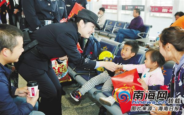 1月21日上午,海口高鐵東站派出所民警在候車廳向春運旅客發(fā)放“暖心紅包”,紅包內(nèi)有糖果、紙巾等。海南日報記者 蘇曉杰 通訊員 潘彤彤 攝