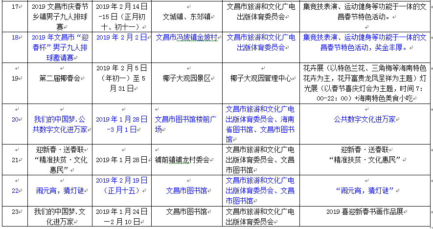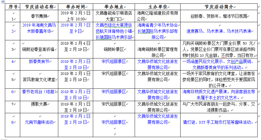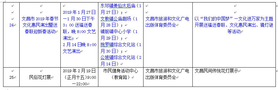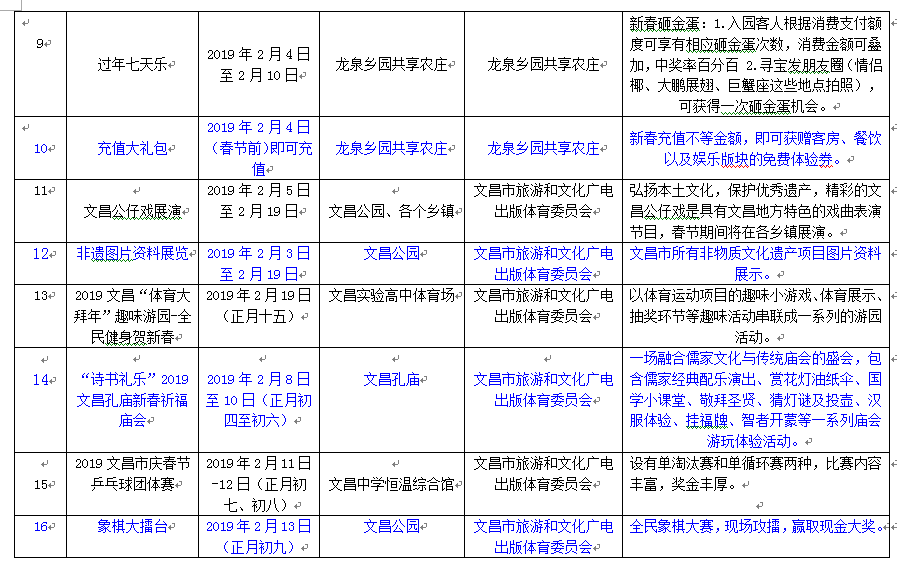 附:2019年春節期間文昌旅游節慶活動匯總表