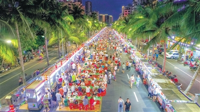 夜幕降臨,華燈初上,??谝故斜汩_始熱鬧起來。自2017年起,??趯ν狻扒笳娼洝睂取跋驴喙ぁ保ν七M特色夜市建設工作,如今,已打造出一批廣受海口市民和國內外游客喜愛的靚麗“名片”。 其中,最有代表性的就是海大南門夜市、金盤夜市、海墾花園夜市、瓊臺福地夜市等。海墾花園夜市大小攤位200余個,匯集了全國各地的佳肴,從南到北、口味大不相同,本地味、川味、西北味、東北味……各種美味小吃讓人應接不暇。海大南門夜市是海口首個試行限時封閉市政道路用于夜市經營的項目,這里美食品種極多,除了粥粉面飯等主食類,還有燒烤、炸炸、牛雜以及炒冰、清補涼、海南糖水等甜點。金盤夜市門口的招牌十分氣派,濱海休閑風格的裝潢讓人感到十分舒適,除了海南本地的特色美食外,金盤夜市還有陜西、湖南、內蒙古、重慶等外地特色美食,品種十分豐富。瓊臺福地夜市是??谧罹哂挟數靥攸c的夜市,其建筑是結合府城多年的歷史文化特點進行改造的,是海口美食新坐標之一。試想在這古色生香的地方吃著美味無比的食物,所謂品古城韻味,用各地美食,豈不快哉?