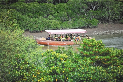 游客坐船游覽海口市東寨港紅樹林旅游區(qū)。 本報記者 袁琛 攝