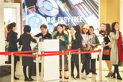 ?市民游客在位于海口市日月廣場的海口免稅店選購商品。本報記者 袁琛 攝