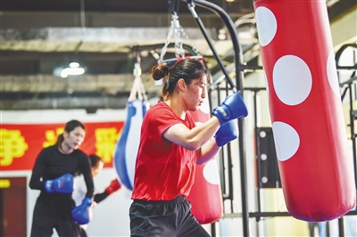 在白沙全民健身中心拳擊訓練館,國家女子拳擊隊隊員正在訓練。 本報記者 袁琛 攝