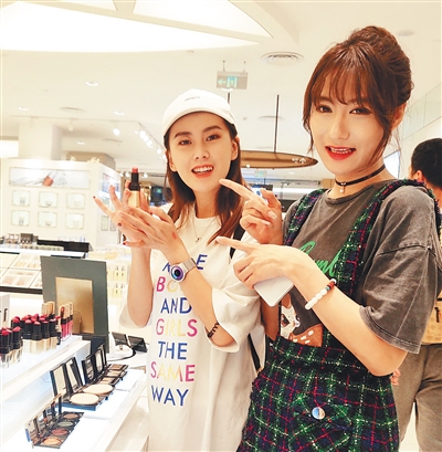 2月20日,參加“網紅伴游,說走就走”海口旅游體驗活動的網紅主播在海口日月廣場免稅店向粉絲推介免稅商品。 本報記者 張茂 通訊員 麗麗 攝