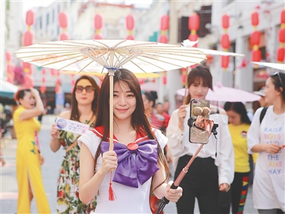 2月19日,參加海口旅游體驗活動的網紅主播在海口騎樓老街作在線旅游觀光直播。 本報記者 張茂 攝