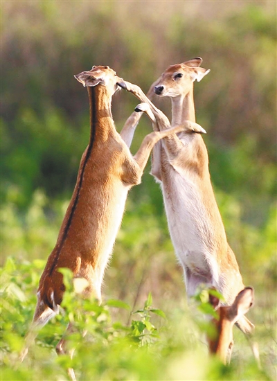 兩只坡鹿在海南大田國(guó)家級(jí)自然保護(hù)區(qū)內(nèi)嬉戲。 海南日?qǐng)?bào)記者 蘇曉杰 攝