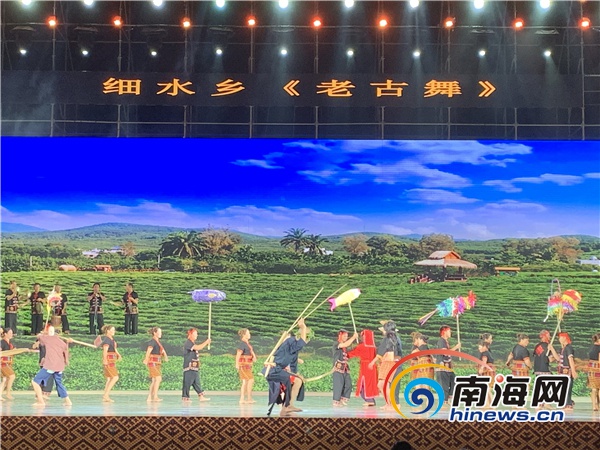 群舞《時代圣火》拉開晚會序幕,黎哥苗妹們穿著各式各樣的民族服飾,在動聽的音樂聲中舞蹈、歌唱。現場觀眾跟著音樂拍打著節奏,揮舞手中的熒光棒。其中群舞《老古舞》以舞蹈方式來訴說遠古時期黎族、苗族人民的生活方式,讓在場觀眾大開眼界。