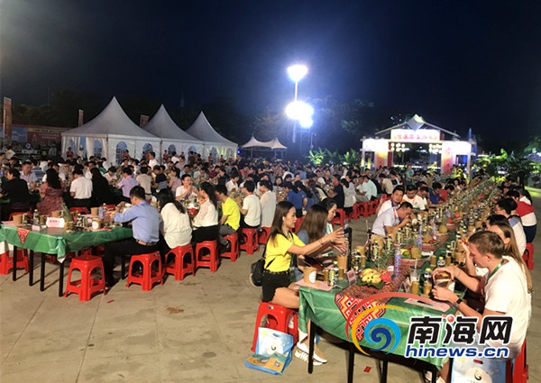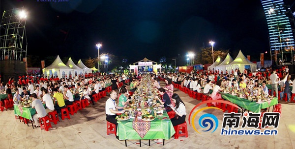 長桌宴是陵水黎族宴席最高形式和最隆重的待客禮儀,每逢佳節,一席長桌宴極大了加深主客情誼。晚上19時許,陵水文化廣場擺開長桌宴,宴請遠道而來的賓朋。長桌宴上,黎族長老潑灑圣水為八方賓朋祈求幸福與平安,捧起黎家山蘭酒三敬賓朋,現場其樂融融。長桌上擺上了陵水的各種美食,現場還有民歌男女對唱、黎族鼻簫演奏、跳竹竿舞等助興。賓客們在觥籌交錯中,共慶“三月三”佳節,感受陵水的好客與熱情。