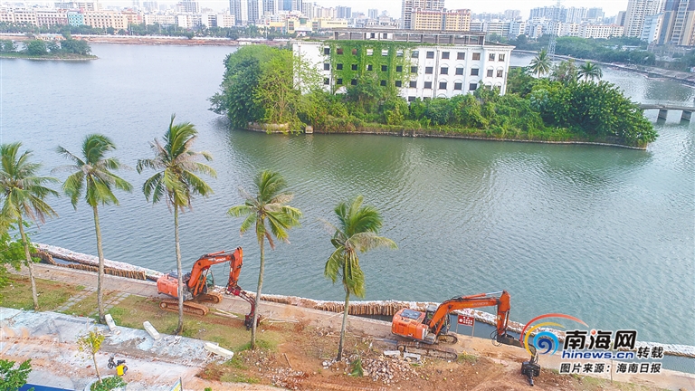 近日, 高空俯瞰海口紅城湖公園項(xiàng)目施工現(xiàn)場(chǎng),挖掘機(jī)正在緊張作業(yè)。