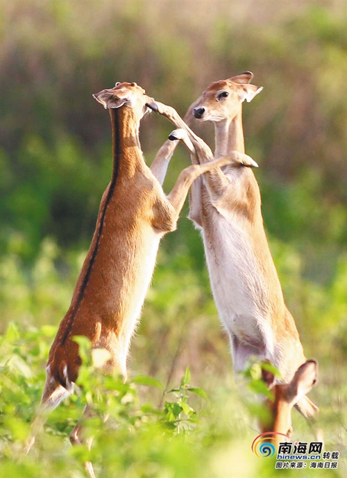 兩只坡鹿在海南大田國家級自然保護區內嬉戲。海南日報記者 蘇曉杰 攝