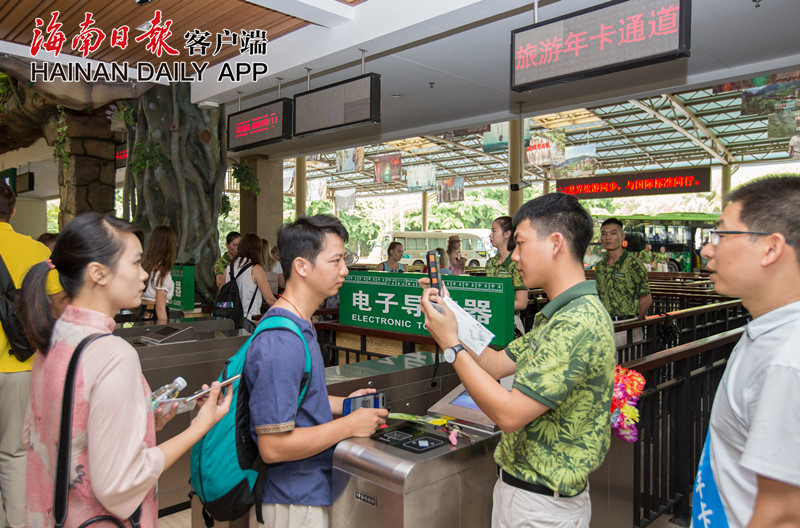 記者在呀諾達雨林文化旅游區和檳榔谷黎苗文化旅游區看到,為了讓游客快捷入園,兩家景區在入園檢票口提前設立了“海南旅游年卡專用通道”,并有專人專崗服務。工作人員手持人臉識別POS機,只需掃碼和刷臉兩個步驟,游客幾秒鐘就可入園,比起現場排隊入園的游客堪稱神速。