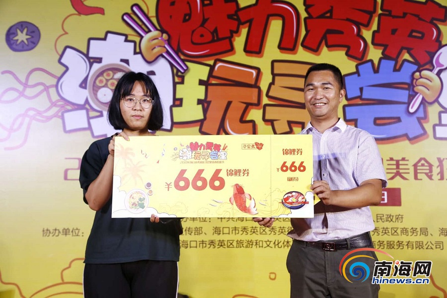2019尋嘗里美食狂歡節(jié),一位幸運市民(左)獲得價值666元的錦鯉券。南海網(wǎng)記者 姚皓 攝