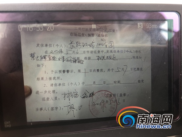海口市工商局給長影環(huán)球100下發(fā)整改通知書。南海網(wǎng)記者 蘇靚 攝