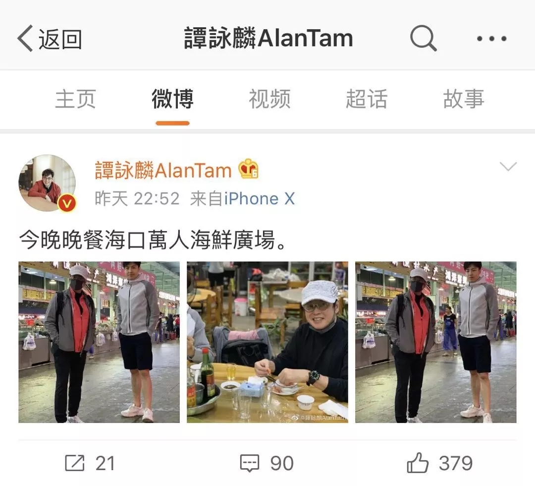 ↑譚詠麟低調現身海口丁村火車頭萬人海鮮廣場,與友人品嘗美味海鮮。圖片來源于譚詠麟微博