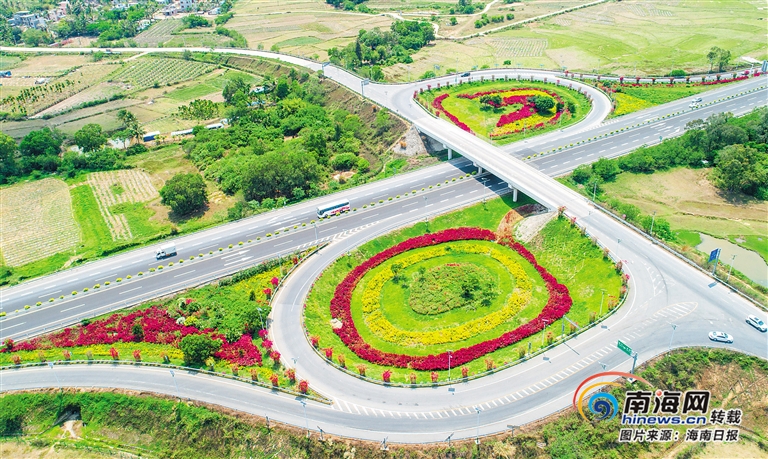 俯瞰G98環島高速東線段陵水文羅互通處,綠樹成蔭,花繁葉茂。武昊 攝