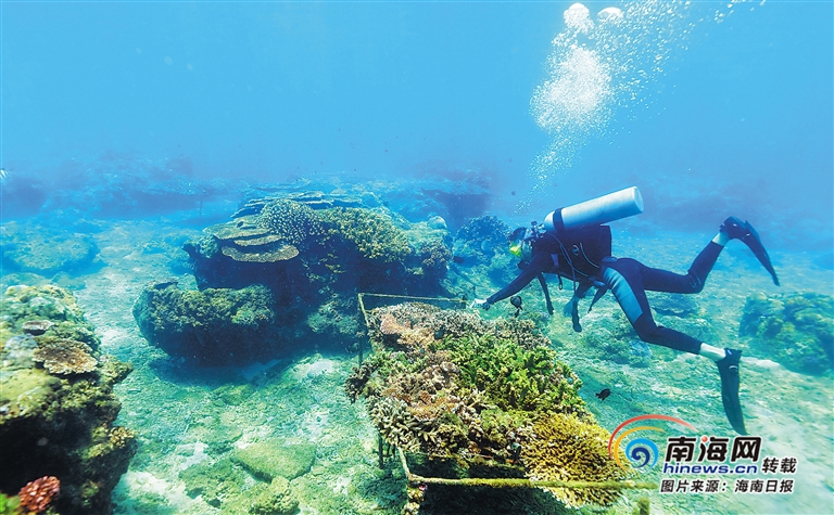 在陵水分界洲島旅游區,工作人員在“海底牧場”的珊瑚保育區進行珊瑚生長情況巡檢。水木 攝