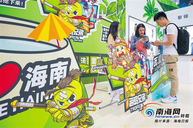 步入海南館,腳下踩著的是金色的“沙灘”,映入眼簾的是郁郁蔥蔥的綠色“雨林”。在濃郁的海島氣息中,設計團隊劃分出展示區、互動區、洽談區。300平方米的展廳有35家企業在此以產品、項目展示進行推介,主要包括陶瓷、貝瓷、貝雕、椰雕、木雕、紙板彩雕、黃花梨、沉香、黎錦、黎族銀飾、景泰藍等12個系列文化創意產品以及文化旅游、影視、演藝、實體書店等項目展示。