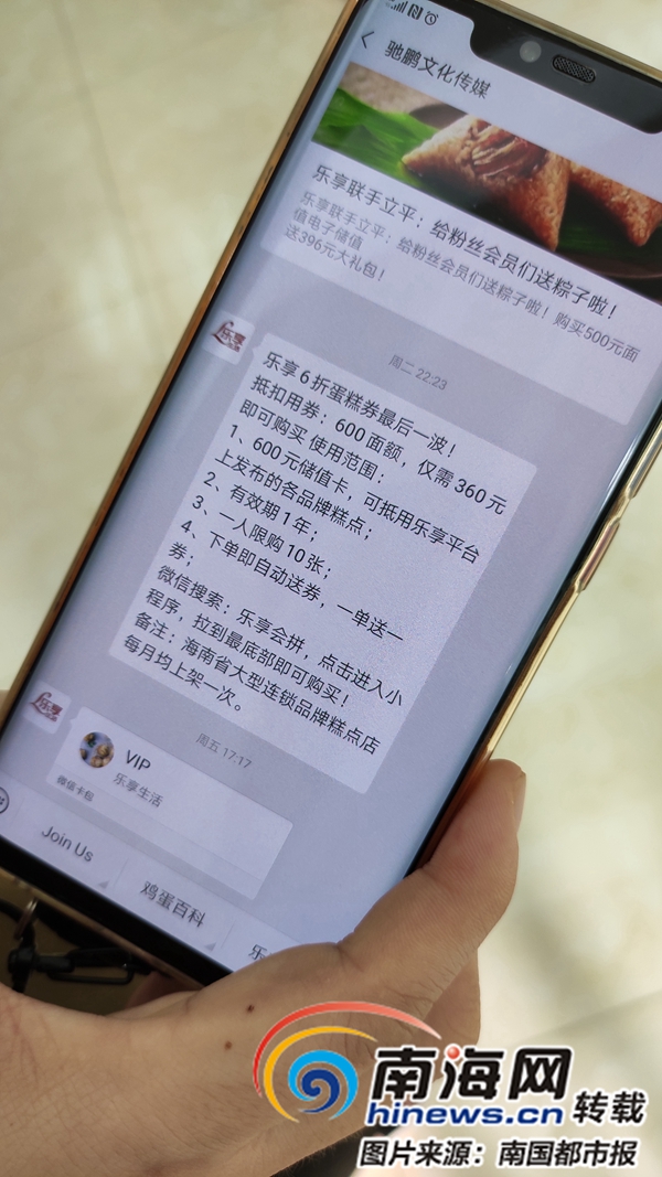 南國都市報5月19日訊(記者 王康景 文/圖)海口一公司通過“樂享團購”活動,發展線下“團長”吸引群眾“入群”參與各類優惠卡團購活動,包括加油卡、超市購物卡、糕點店卡、水果品牌連鎖店購物卡等等,按照6折至9折不等的優惠出售給“團員”。然而,很多人付款后發現,公司不及時發卡,或者所發卡并無金額。19日,海口不少參加團購優惠卡的市民向公安機關投訴海南馳鵬文化傳媒公司涉嫌欺詐和非法集資,所涉金額數百萬元。目前,事件還在進一步調查中。