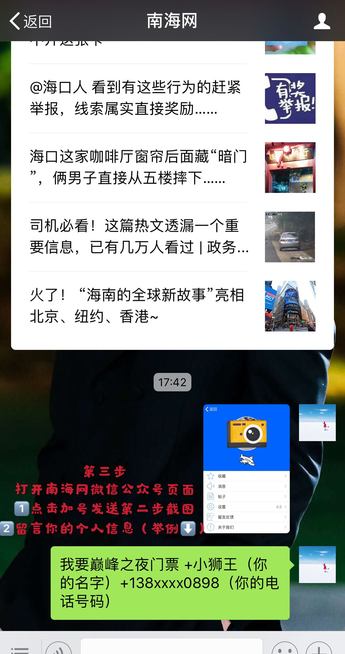 第三步:打開(kāi)并關(guān)注“南海網(wǎng)”微信公眾號(hào),將第二步的截圖以及姓名、電話、觀看場(chǎng)次(30日或31日)和截圖發(fā)給南海網(wǎng)微信公眾號(hào)小編進(jìn)行報(bào)名。