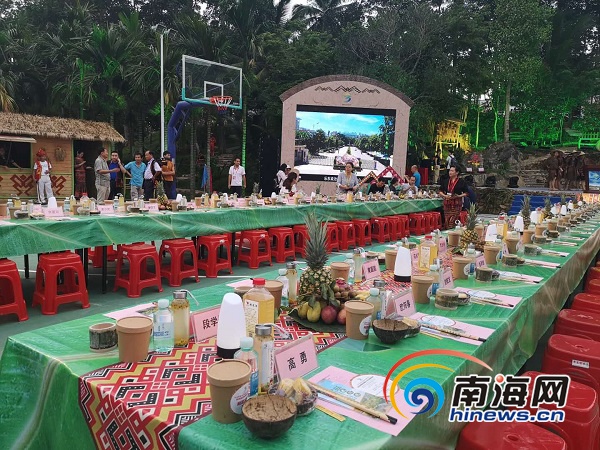 在抱班村的廣場上,一字排開的黎家長桌宴非常“吸睛”,山蘭酒、利國涼粉、熱帶水果、果汁飲料擺放整齊,地道的美味讓四方賓客在“舌尖”認識樂東、了解樂東。