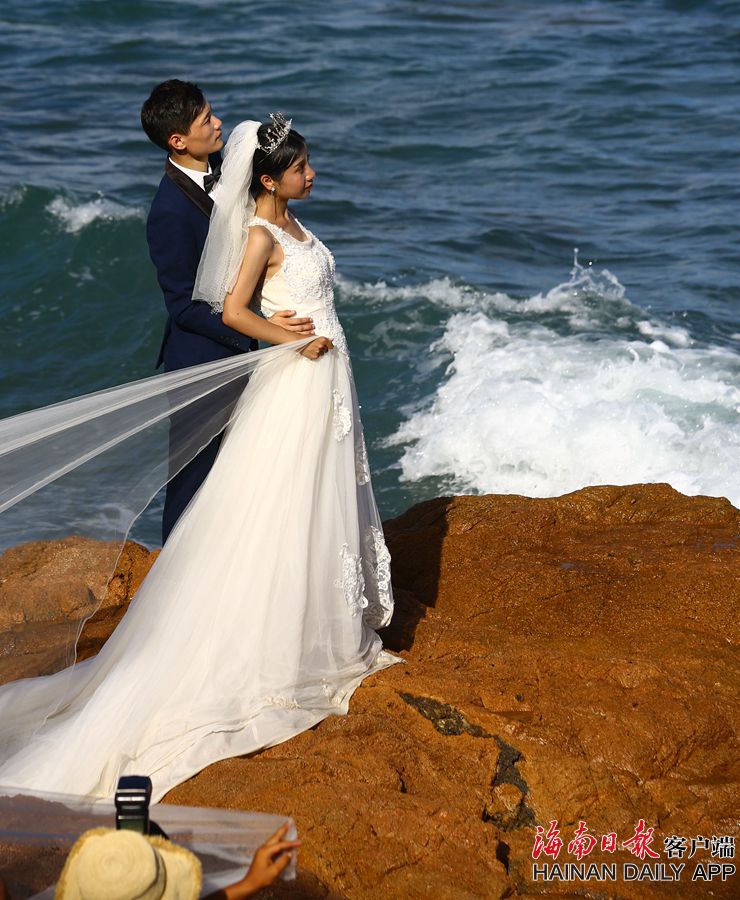 6月8日,一對新人在三亞南山景區(qū)海邊拍攝婚紗照。 據(jù)海南日報客戶端|記者 袁琛 特約記者 陳文武 攝影報道