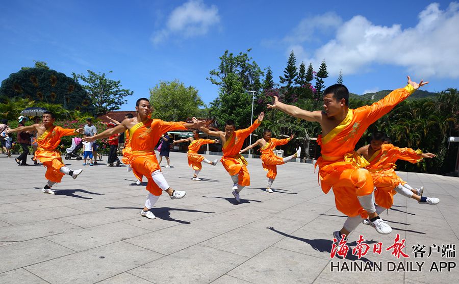6月8日,“小武僧”在三亞南山文化旅游區(qū)給游人表演功夫套路。 據(jù)海南日報客戶端|記者 袁琛 特約記者 陳文武 攝影報道