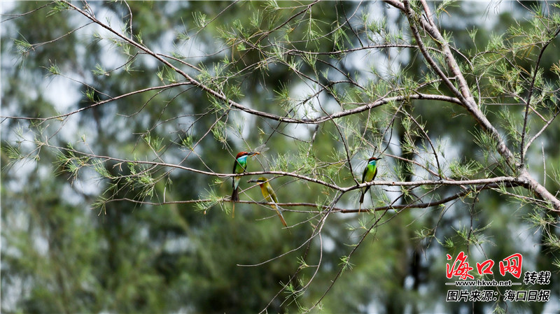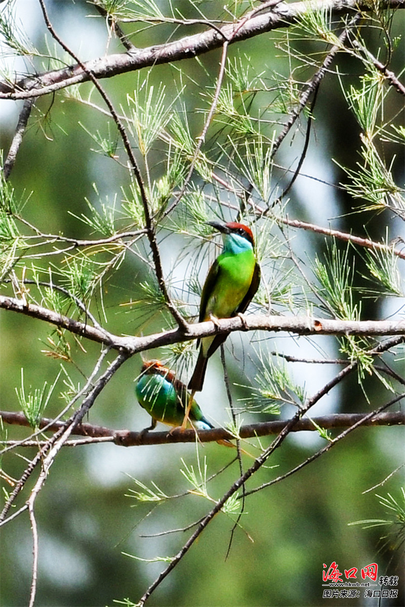 6月11日,在海口市五源河濕地公園內(nèi),記者的鏡頭捕捉到兩只在此處棲息的藍喉蜂虎。藍喉蜂虎頭頂至上背為栗紅色,頦、喉和頸側(cè)呈現(xiàn)藍色,姿態(tài)優(yōu)美色彩亮麗,數(shù)量稀少,因此成為不少攝影愛好者心目中的“大明星”。 記者 石中華 攝
