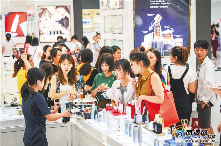 6月16日,??谑袊d大道日月廣場免稅店內,各類商品琳瑯滿目,吸引眾多消費者前來選購。海南正在實施的更加開放便利的離島免稅購物政策,對消費者產生了巨大吸引力。