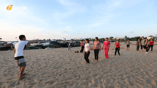 在休漁期中,不少漁民還是聚集到了鶯歌海海邊,定期在這里舉辦沙灘排球、跳繩、拔河、絆腳等娛樂(lè)活動(dòng)。