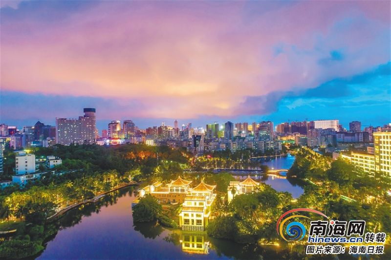 7月1日傍晚時分,高空俯瞰經過全新升級改造后的海口東湖湖心島靚麗夜景。