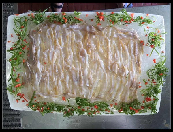 4、最后將切好的象蚌一片片鋪在冰碎上即可。