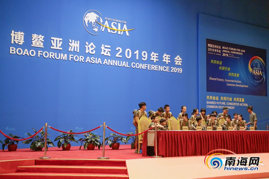 導游帶領2019年瓊海市留守(困境)兒童夏令營參營小學員參觀博鰲亞洲論壇會址。南海網記者 李昊 攝