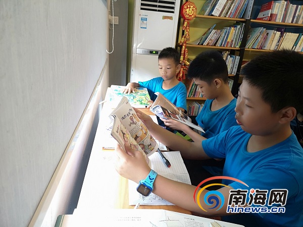 孩子們?cè)诤?谌嗣耱T兵營(yíng)的圖書室內(nèi)瀏覽圖書。南海網(wǎng)記者 蘇靚 攝
