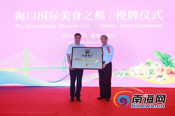 7月19日上午,世界中餐業(yè)聯(lián)合會(huì)常務(wù)副會(huì)長(zhǎng)邢穎(右)代表世界中餐業(yè)聯(lián)合會(huì)向海口市頒發(fā)“國(guó)際美食之都”的證書(shū)和牌匾。南海網(wǎng)記者 任桐攝