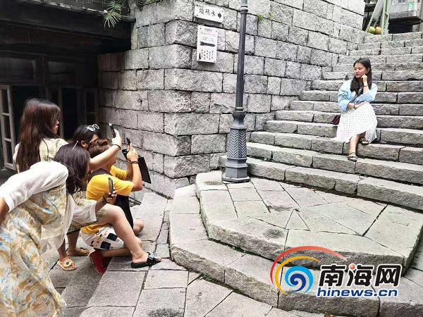 海口觀瀾湖華誼馮小剛電影公社內(nèi),游客在拍照留影。南海網(wǎng)記者 蘇靚 攝
