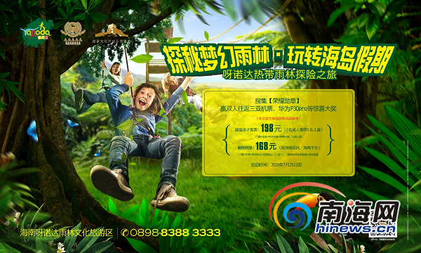 7月25日起,呀諾達雨林文化旅游區將在雨林自主探索較為成熟的基礎上挖掘個性玩法,以“網紅打卡+游戲互動”為核心路線串聯景區各大景觀點,通過跳躍天空之境、氣球的高空之旅、雨林障礙攀巖、猜猜我是什么水果、顛球大作戰、趣味知識小百科等系列活動帶領游客探秘夢幻雨林、玩轉海島假期。游客集齊“榮耀勛章”參與現場抽獎,即有機會成為暑期大贏家,活動獎項分別為一等獎1名,獲贈雙人往返三亞機票(最高金額7000元);二等獎2名,獲贈華為P30pro手機1臺;三等獎3名,獲贈呀諾達雨林一號酒店客房1房晚、景區所有項目體驗1份;四等獎5名,獲贈價值606元的雨林玩家套票兩張。
