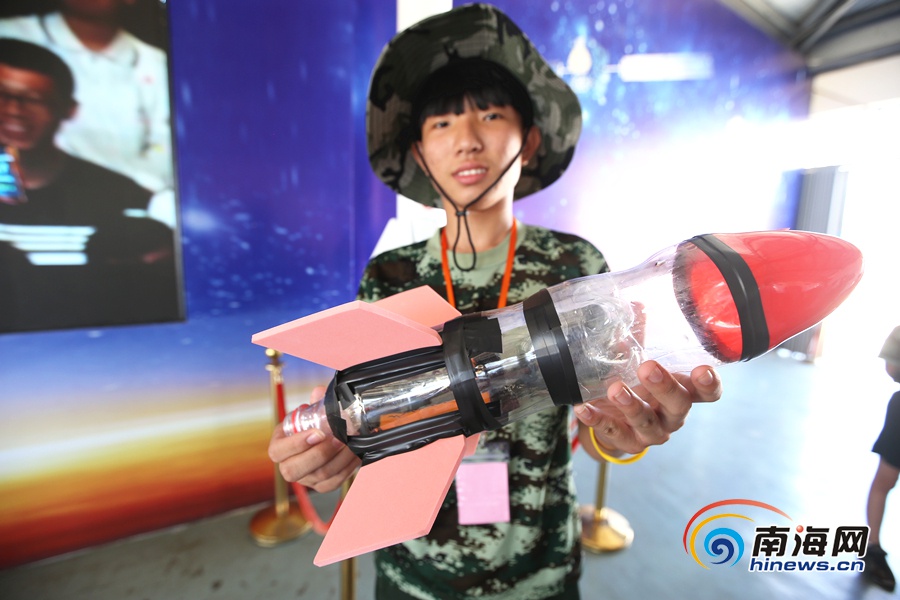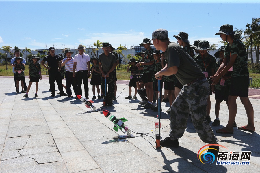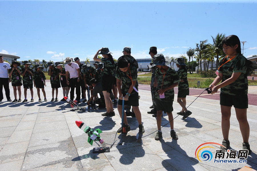 瓊海留守(困境)兒童夏令營營員自制水火箭進行模擬發射。南海網記者 陳望 攝