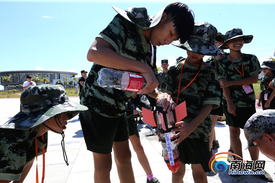 小營員往“水火箭”里注水,準備發射。 南海網記者陳望 攝