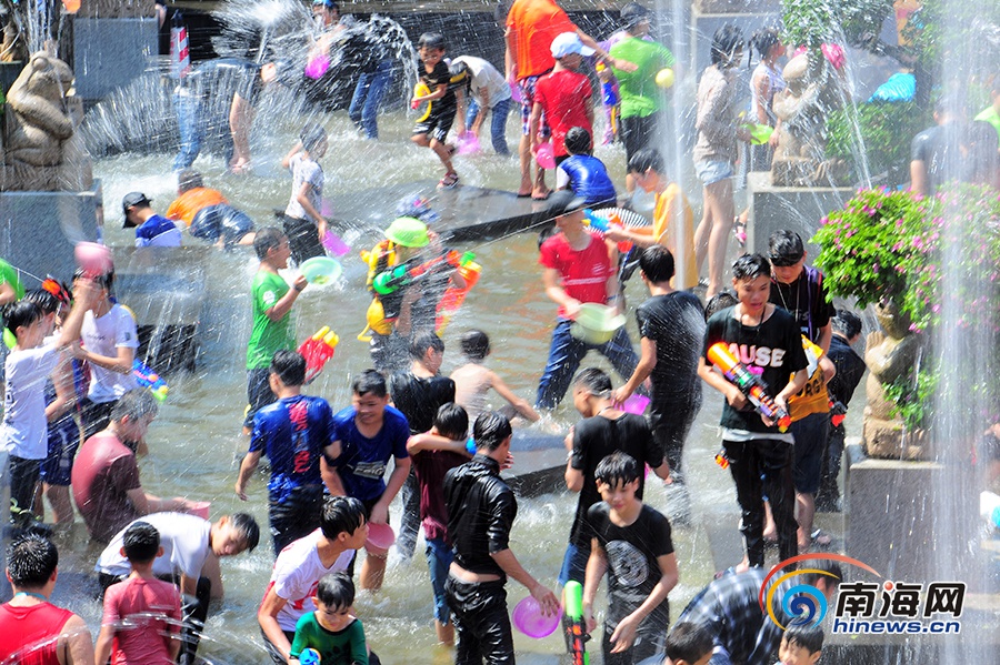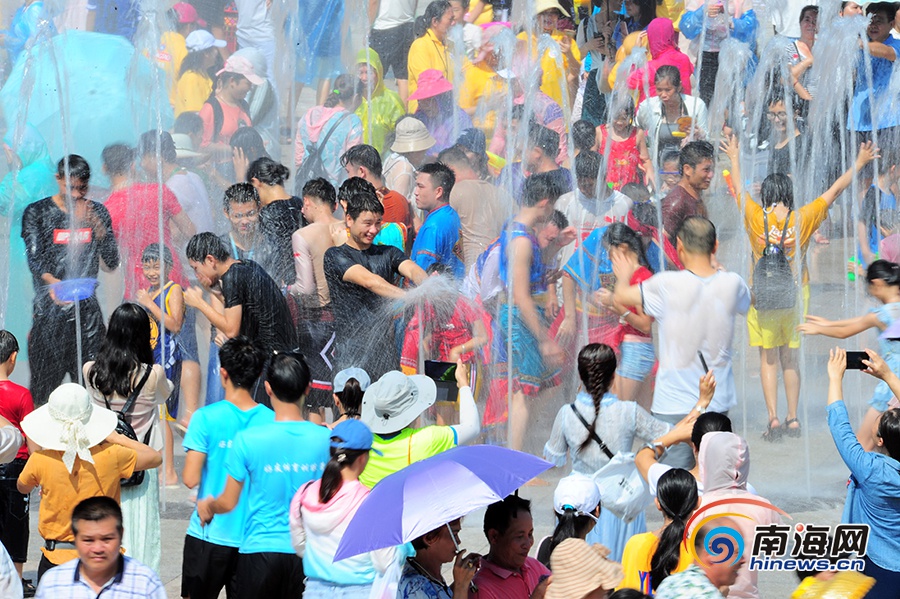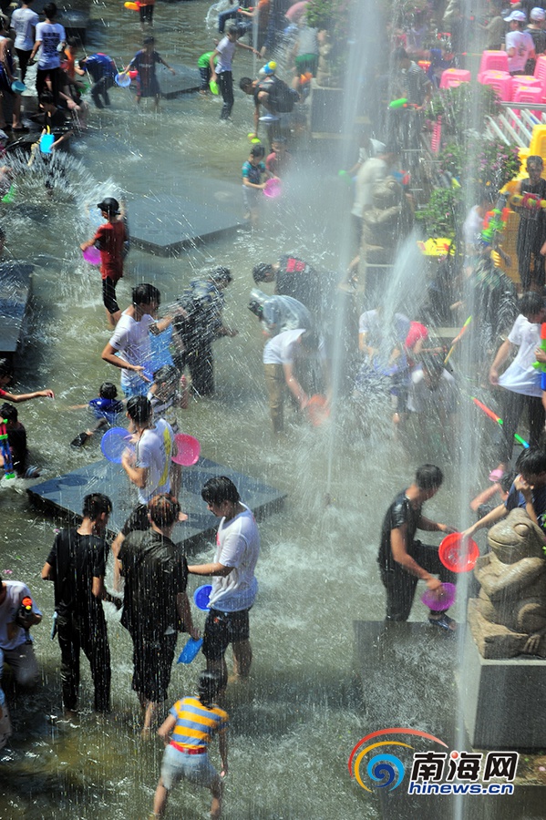 歡樂仍在延續,越來越多的游客加入到舞蹈方陣中,無論男女老少,不論相識與否,每個人臉上洋溢著燦爛的笑容。廣場噴泉的閥門也隨即被打開,一條條水柱揮舞,不少游客趁勢開始了嬉水狂歡,他們拿著各式各樣的塑料水盆或塑料水槍,歡快地相互潑水嬉戲,傳遞祝福。