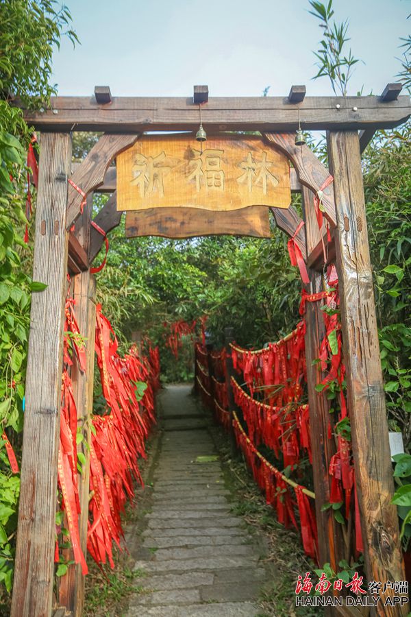 嶺上植被生長繁茂,種類眾多,獸類有20多種,鳥類有60多種,形成了一座天然的生態植物園、百草園和野生動物園。還有奇巖異石,千姿百態,形成了一座幽邃迷人的海濱石景公園。 圖為祈福林。海南日報記者袁琛 見習記者封爍 攝影報道