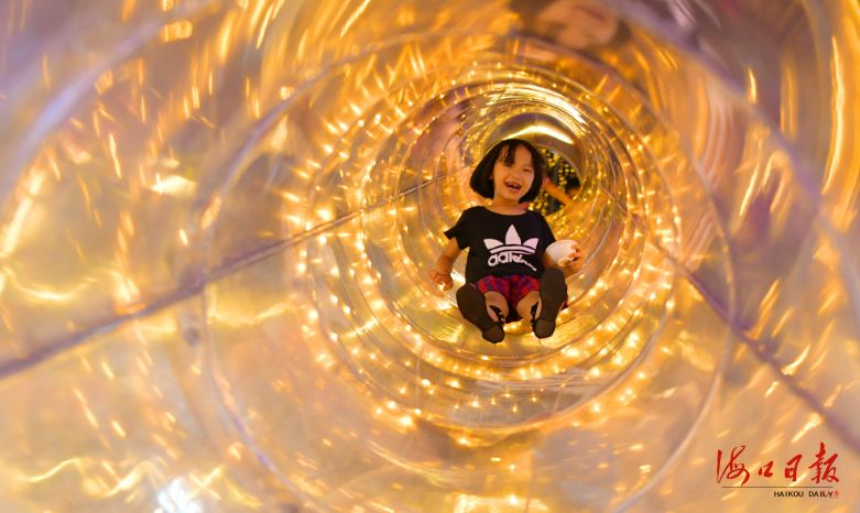 小朋友在尋嘗里美俗夜市內的管道滑梯玩耍。海口日報記者 黃一冰 攝