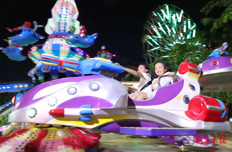 小朋友在火車頭萬人海鮮廣場的游樂設施上開心地玩耍。海口日報見習記者 王程龍 攝