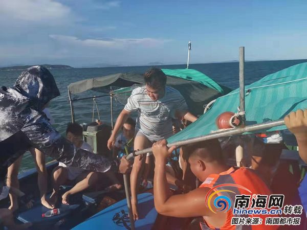 南國都市報8月12日訊(記者 譚琦 通訊員 蔡佳明 文/圖)11日,5名游客在三亞皇后灣海域進(jìn)行沖浪游玩時遇險,經(jīng)當(dāng)?shù)貪O民和海上救援隊及時協(xié)調(diào)救助,5名游客被成功營救。