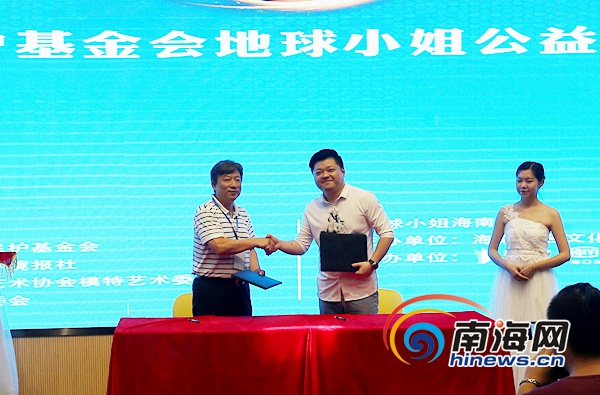 中華環(huán)境保護基金會代表與本次賽事主辦方代表共同簽訂《中華環(huán)境保護基金會地球小姐公益基金》。南海網(wǎng)記者 陳望 攝
